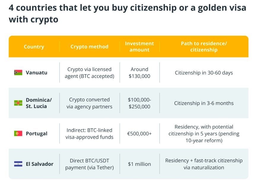 While some programmes offer direct crypto integration, others use intermediary solutions to meet government requirements. Across Vanuatu, El Salvador, Portugal and the Caribbean nations, options vary in timeline, investment size and crypto acceptance methods, providing flexibility for crypto-rich investors looking to secure a second passport or residency.