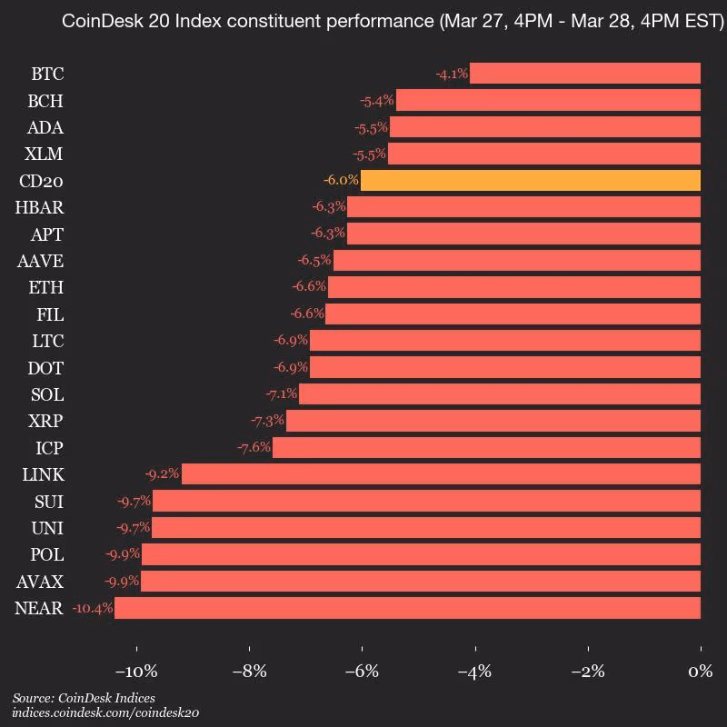 Just a day ago, Bitcoin hovered near $88,000. By Friday, it had slipped to $83,800, marking a 3.8% daily loss. The CoinDesk 20 Index fell 5.7%, with altcoins like Avalanche (AVAX), Polygon (POL), Near (NEAR), and Uniswap (UNI) each losing around 10%.