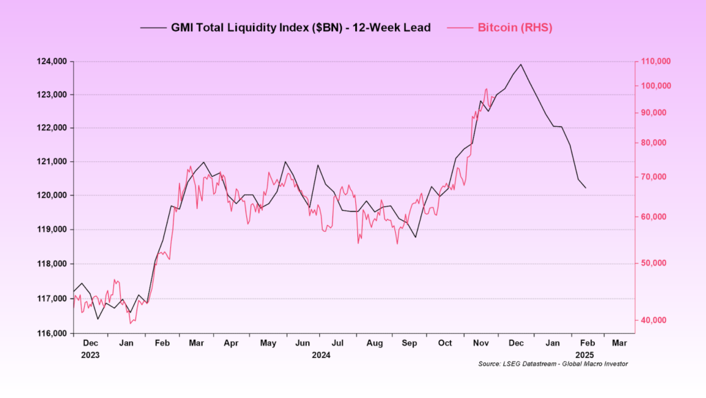Other analysts have also forecasted a potential Bitcoin bottom near $70,000 in early 2025 before the next major rally. Based on its correlation with the global liquidity index, Bitcoin’s right-hand side (RHS) bid price may fall below $70,000 by the end of February, following its peak near $110,000 in January.