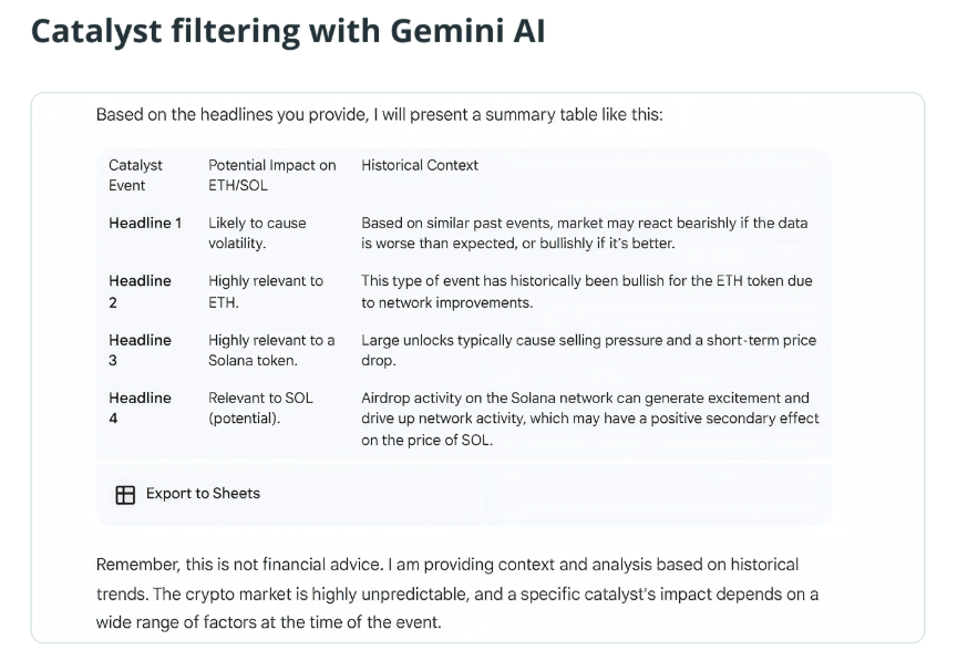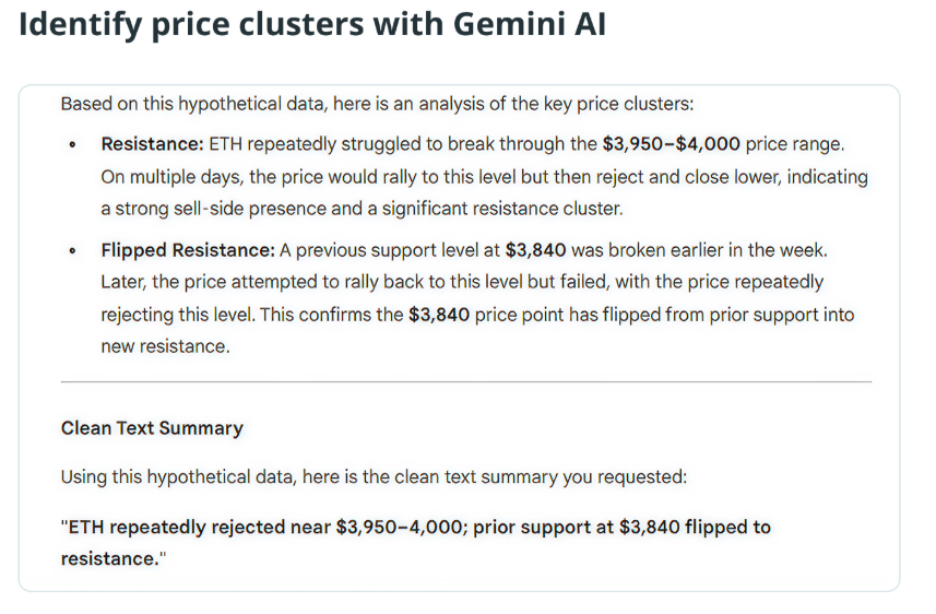 For example, Gemini can summarise which assets in a watchlist showed the largest 24-hour swings or highlight which news catalysts are most likely to influence ETH or SOL based on past reactions. It can also interpret OHLCV data to mark resistance clusters or turn complex futures positioning into clear summaries of whether sentiment is skewed long or short.