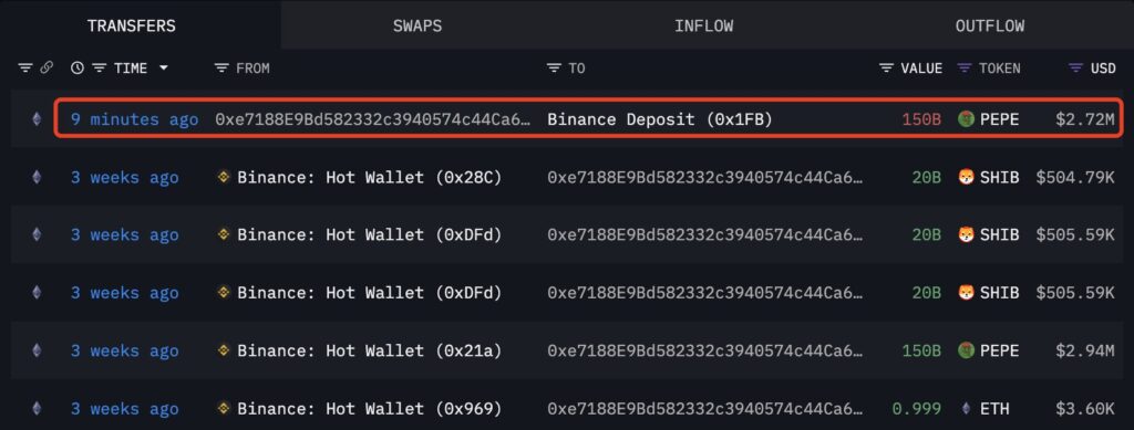 A notable transaction involving 150 billion PEPE tokens has drawn attention from the cryptocurrency community. A PEPE whale, previously seen withdrawing the same amount, recently deposited the tokens on Binance, sparking speculation about their trading strategy.