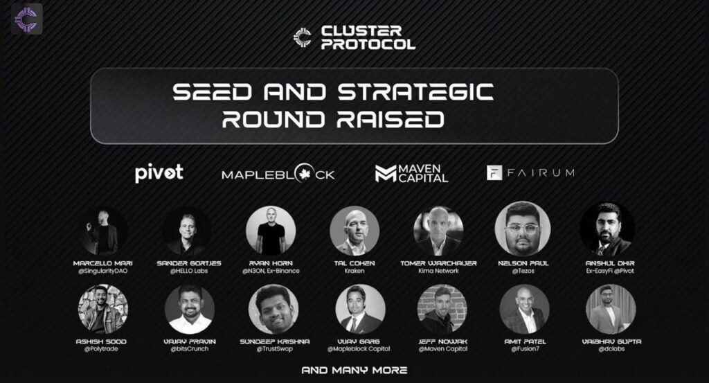 The funding round was led by Pivot Ventures and saw the participation of esteemed investors, including Maven Capital, Mapleblock, and several prominent angel investors. Notable contributors include Ryan Horn (Binance), Tal Cohen (Kraken), Sanders Gortjes (Hello Labs), Jeff Nowak (Maven Capital), Amit Patel (Fusion 7), Nelson Paul (Tezos), Marcello Mari (SingularityDAO), Vijay Praveen (BitsCrunch), Ashish Sood (Polytrade), Tomer Nuni (Kima Network), Vijay Garg (Mapleblock), Sundeep Krishna (Trustswap), Vaibhav Gupta (dclabs), and Anshul Dhir (Pivot). Their support signifies confidence in Cluster Protocol’s vision of democratizing AI and building a more inclusive technological future.