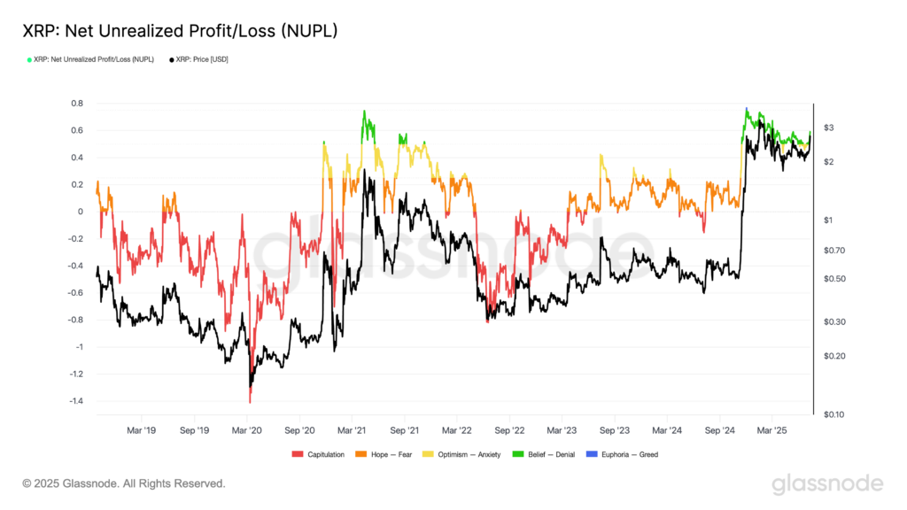 According to Glassnode’s Net Unrealized Profit-Loss (NUPL) metric, XRP has entered the “belief–denial” phase of the market sentiment cycle. This stage typically appears after a period of optimism and suggests further upside may be possible.