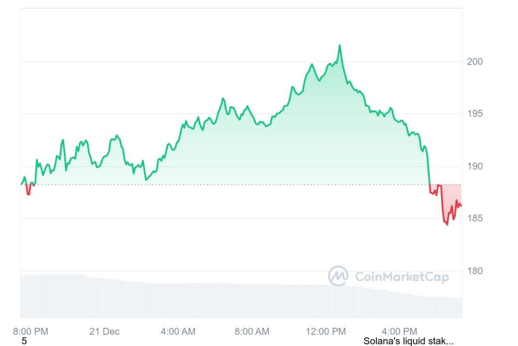 As of now, Solana is trading at $186.79, marking a 1.05% decrease in the last 24 hours. The cryptocurrency holds a market capitalization of $89.50 billion, with a 24-hour trading volume of $12.05 billion. Solana maintains a market dominance of 2.64%, reflecting its significance in the crypto ecosystem despite recent setbacks.