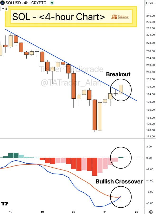 Amid the decline, technical indicators suggest that Solana may be poised for a rebound. Analyst Trader Tardigrade highlighted bullish signals on the 4-hour chart. Key observations include: