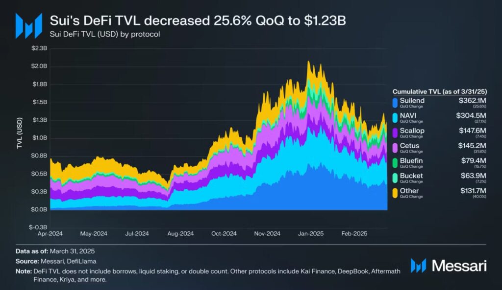 Sui’s DeFi ecosystem weathered significant contractions, yet its evolution continued unabated. Lending protocol Suilend retained its leadership position, closing the quarter with $362.1 million in total value locked (TVL), a 25.6% decline. Its market share stood at an impressive 29.3%, supported by the launch of STEAMM, a superfluid automated market maker (AMM) designed to optimize capital efficiency by utilizing LP assets across lending and swaps.