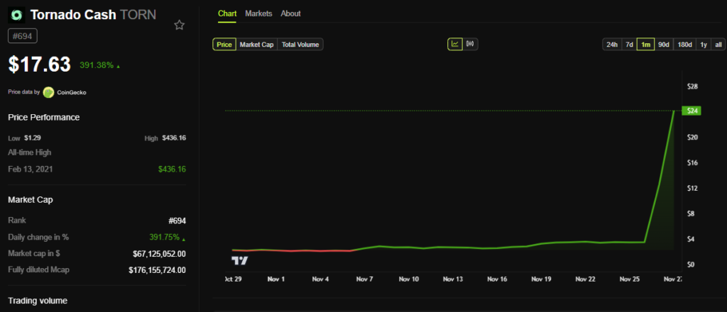 Following the ruling, Tornado Cash’s native token, TORN, experienced a meteoric rise of nearly 400%, trading at $17.63. This surge reflects renewed investor confidence in the platform’s potential to re-establish itself as a key player in decentralized finance (DeFi).