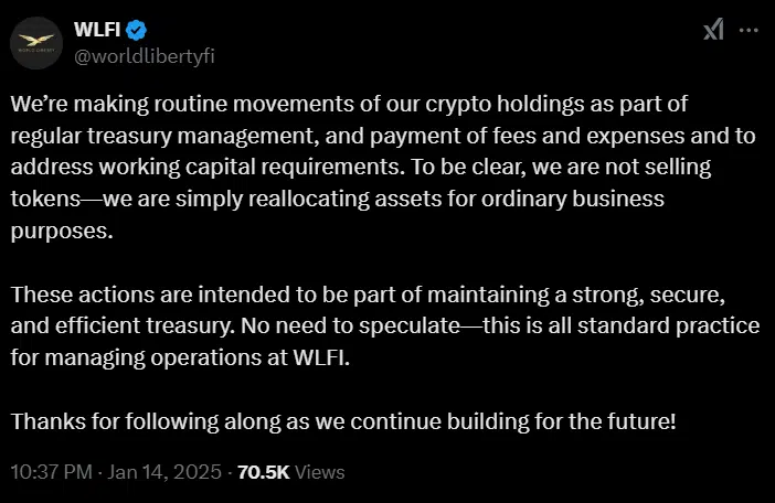 WLFI has been quick to clarify that these large transfers are part of their normal treasury management activities. In a statement posted on X (formerly Twitter), the project explained that the funds were moved to address “working capital requirements” and to cover various “fees and expenses.” The transfers involved multiple wallets, including major crypto exchange platform Coinbase Prime, and were described as standard operational practices.