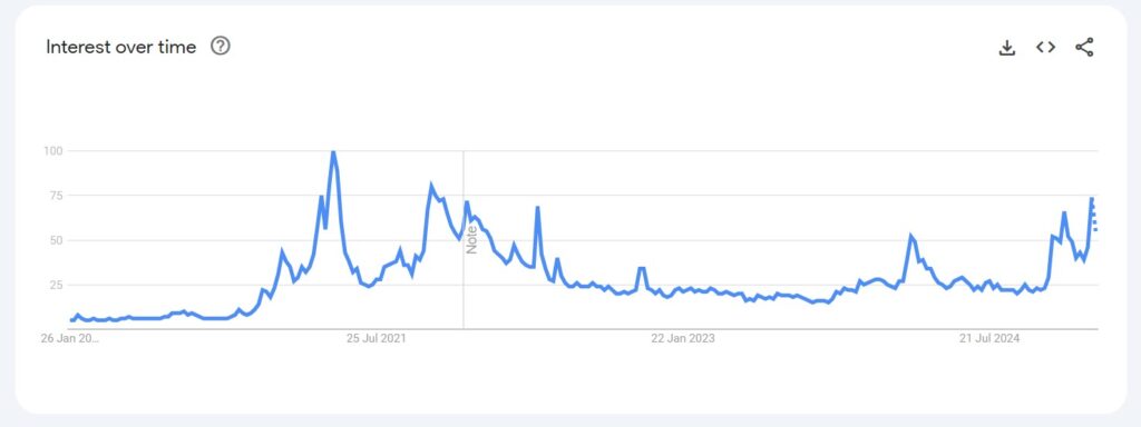 Google searches for related terms, including “memecoin,” “buy crypto,” and “Solana,” also surged during this period. The renewed interest mirrors levels last seen when Bitcoin hit an all-time high of over $67,000 in November 2021.