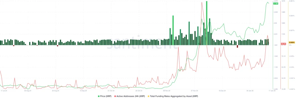 XRP’s on-chain indicators support its continued upward trajectory. Metrics such as funding rates, active addresses, and supply distribution highlight strong investor participation: