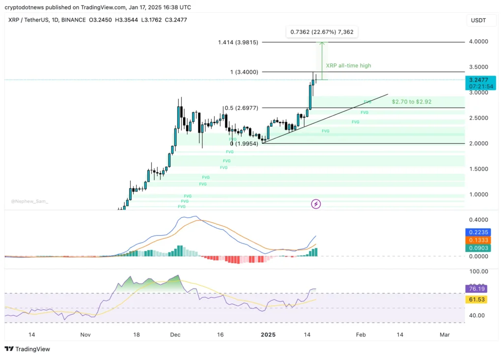 XRP currently hovers near its all-time high, with analysts projecting a potential 22% rally to the 141.4% Fibonacci retracement level at $4.15. Key technical indicators support the bullish outlook: